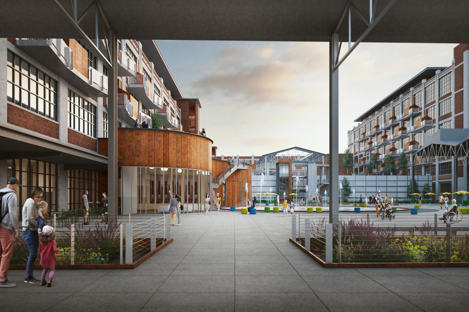 The plan creates a unified, urban campus anchored by community gathering spaces. An amenity structure, repurposed from its original use as a power building, anchors the site visually with its iconic towering brick smokestack enhanced with and surrounded by an outdoor plaza, water features and curving Budd Factory graphic history wall. The plan integrates vehicle parking, truck access, loading/receiving areas and security that are key functional requirements for a successful biocluster campus.