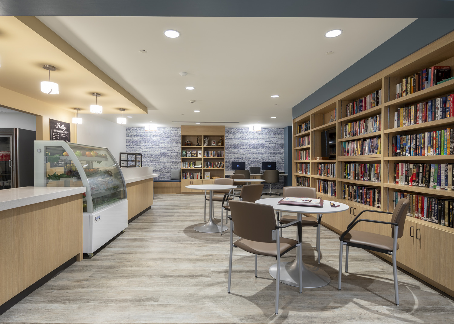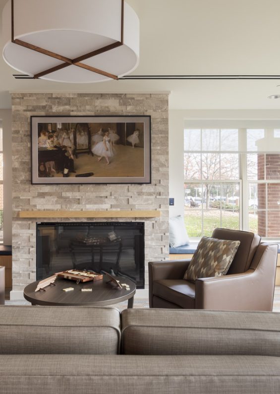 Through a long-term partnership with JCHC, DIG has helped create renewed assisted, independent living and memory care facilities for the Jewish community in both South Orange and Whippany, NJ. The alterations to Heller Independent Living and Weston Assisted Living provide modern, accessible amenities to the residents and support a greater sense of community. DIG partnered with JCHC and the Lester Senior Living management to update the amenity offerings on both the 1st and 2nd floors of their established assisted living and independent living communities. Alterations to the 1st-floor area aim to create a more interactive environment for residents, includeing a café, a reading room, and a refurbished dining room. A new theater with tiered seating on the 2nd floor to enhance resident the movie-viewing experience equipped with THX-quality surround sound, a marquee, and concession area. The renovation also introduces improved access to the rear courtyard of the building, allowing residents to enjoy outdoor spaces with greater ease. Additional services included environmental graphic concepts for inclusion in grant applications, resident presentations, and marketing content. This marks DIG’s second project for JCHC at this site. In 2019, DIG renovated the Weston Assisted Living wing, transforming an entire floor into a self-contained Memory Care Unit. This unit features 12 apartments, a nursing station, a dining room and lounge, a quiet room, and dedicated outdoor space for residents. Both projects enhance Lester Senior Living’s offerings as a full-service, multi-level care facility. Both renovations breathe new life into the facility, as well as draw interest for potential new residents to this 30-year-old community.